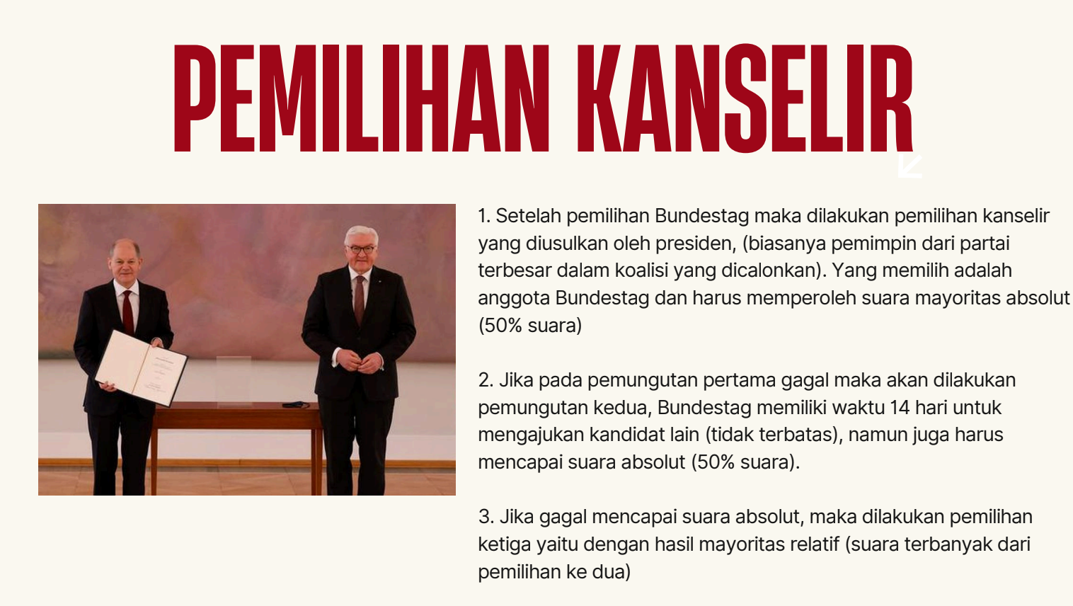 Berikut tahapan resmi pemilihan Kanselir sesuai aturan Konstitusi Jerman (Grundgesetz):